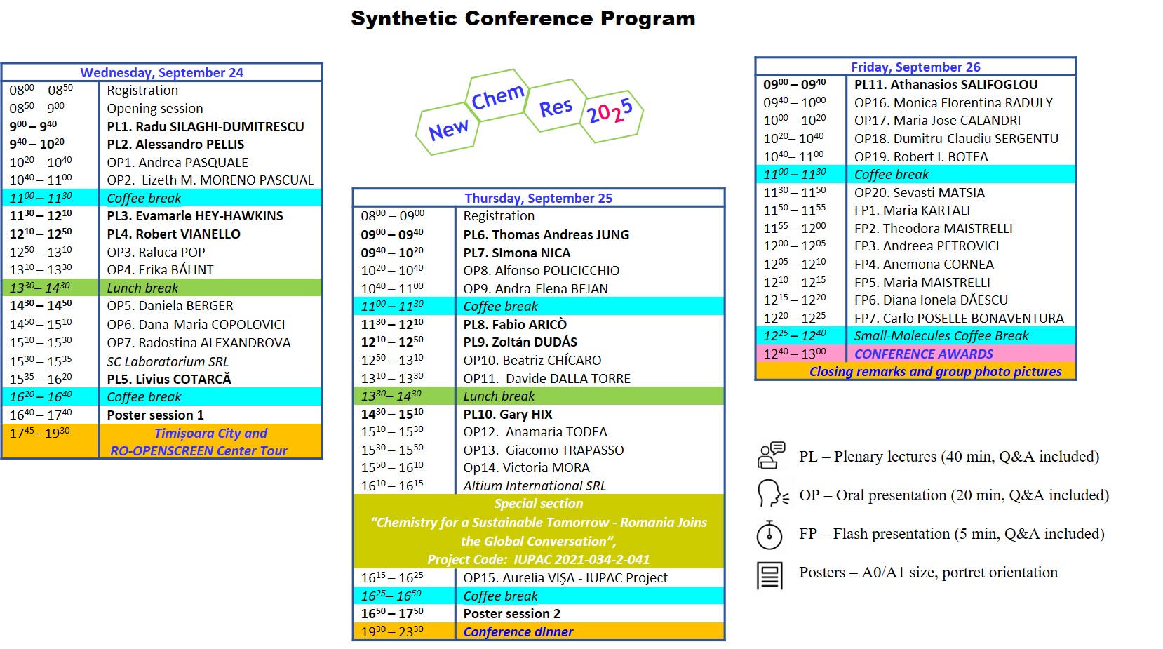 The conference registration will take place in the lobby of the “Coriolan Dragulescu” Institute of Chemistry, 24 Mihai Viteazu bvd., Timisoara, every day of the conference between 8 and 8.50 a.m. -
